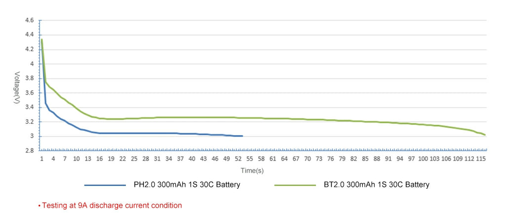 There is a graph of comparison between BT2.0 connector and PH2.0 connector (solid pins version) in BETAFPV 1S 300mAh battery. The discharge current is 9A in this testing. You could see that it has double time ( about 2minutes) and a 0.2v improvement in voltage sag with BT2.0 connector.