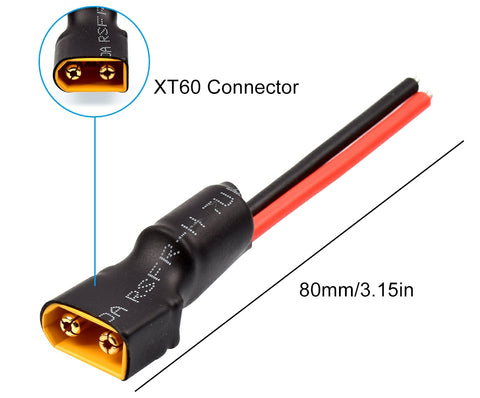 - XT60 plug male connector has 80mm length with 16AWG silicone cable, weighs 8.9g/pc