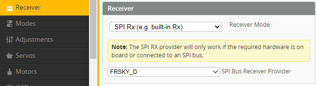 - Receiver: SPI Frsky D8 (CC2500 chip, adjustable)
