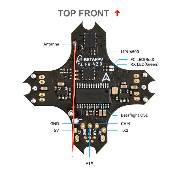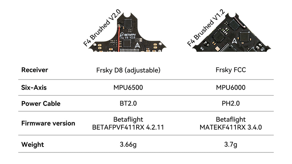 The classical F4 Brushed Flight Controller comes back with new changes and particular shapes. Build-in CC2500 chip, the default protocol is configured to Frsky D8 out of the factory and can be adjusted to Frsky D16 FCC, Frsky D16 LBT, or Futaba. Besides, the power cable adopts BT2.0 connector instead of PH2.0, which improves the performance and is compatible with BETAFPV BT2.0 series batteries.
