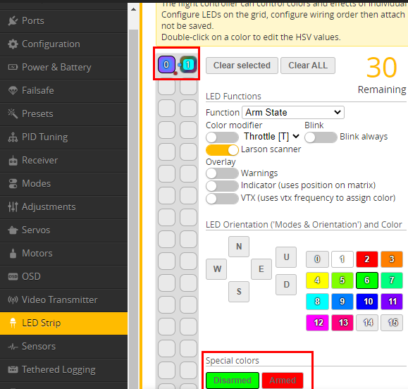 It supports custom RGB lights on the Betaflight configuration.