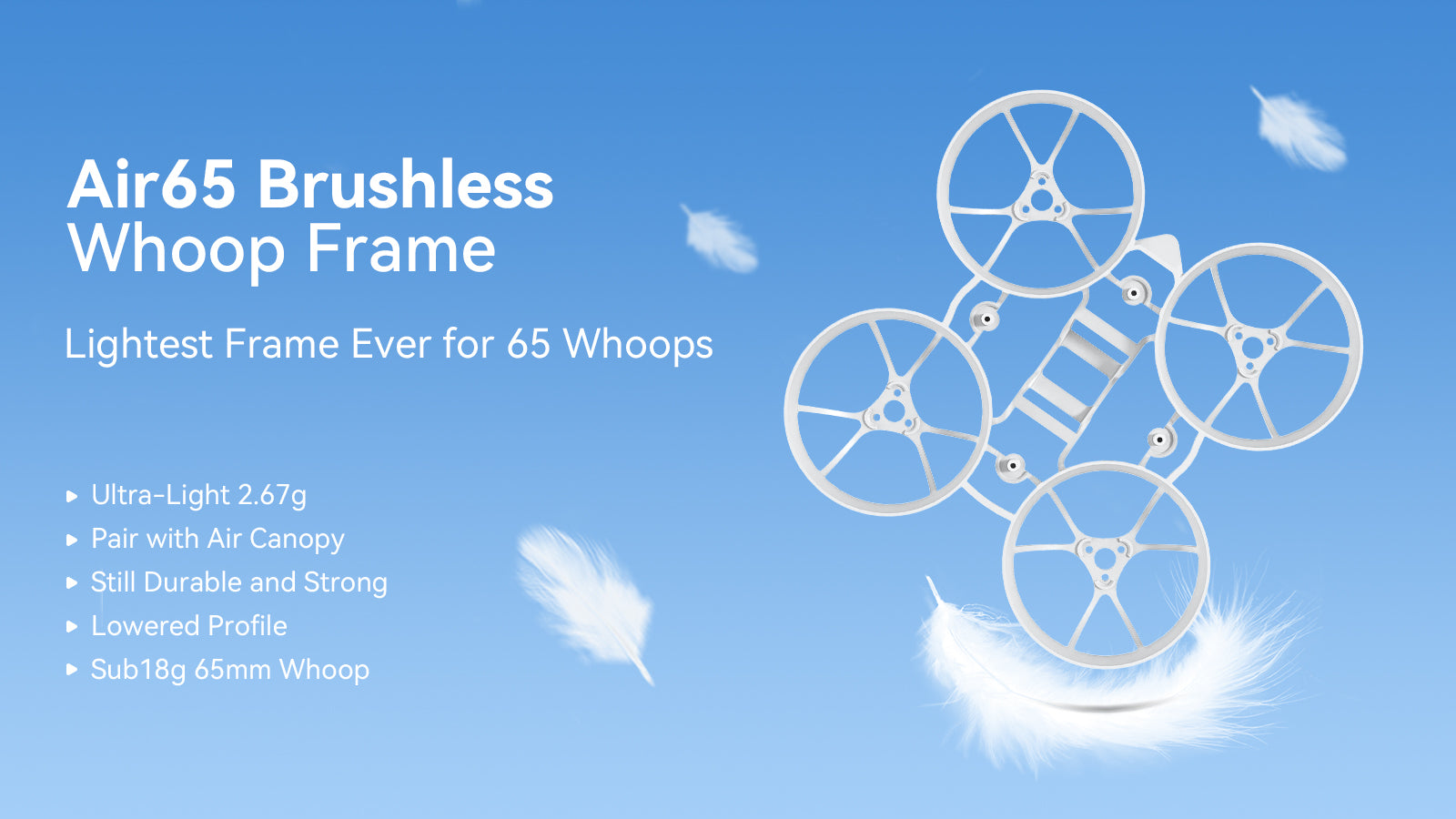 • Weighing a mere 2.67g, this Air65 Brushless Whoop Frame exemplifies exceptional ultra-light structure while maintaining remarkable durability and crash resistance.