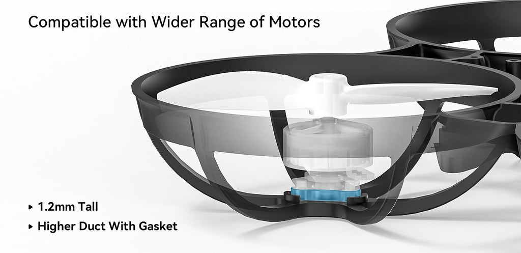 • The duct diameter is enlarged from 32mm to 34.9mm, which improves compatibility and avoids propeller strikes.