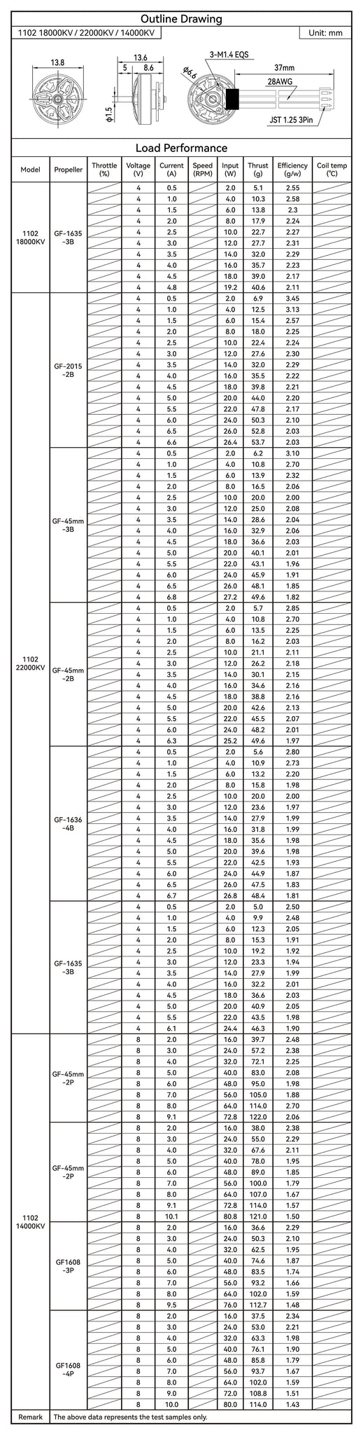 - The classical 1102 18000KV brushless motors have 37mm/50mm cable length versions. 1102 18000KV motors have a good performance in efficiency and the 22000KV version with higher KV value can provide more thrust for aggressive indoor FPV racing. Whether the classical 1102 18000KV or the new 18000KV version, they have the same performance.
