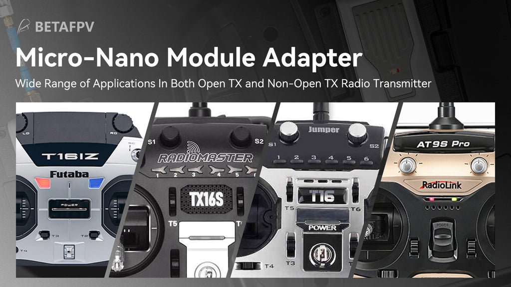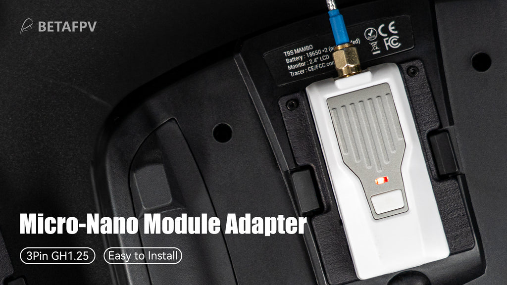 With the use of micro-nano module adapter, nano tx module can work on transmitters with a Micro port (or JR port) easily. Especially, it supports BETAFPV ELRS Nano TX Module.