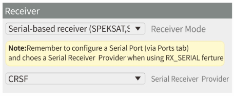 On the “Configuration” tab, select “Serial-based receiver” on the “Receiver” panel, and select “CRSF” as the protocol. Telemetry is optional here and will reduce your stick update rate due to those transmit slots being used for telemetry.