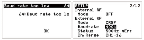 • Solution: First update the baud rate (greater than 400K) setting in the Hardware from the Model Setup menu or System menu, then restart the radio transmitter to ensure the baud rate setting has been applied. Then change the Packet rate.