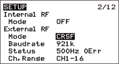 In the EdgeTX system, navigate to MODEL SEL and enter the SETUP menu. Disable Internal RF (set to OFF), enable External RF, and set the Output Mode to CRSF, as shown in the picture below.